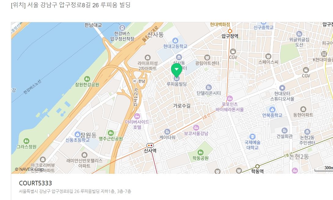 - 서울 강남구 압구정로8길 26 루피움빌딩코트5333(COURT5333) 7층 세미나실, 신사역 8번 출구 도보 750m