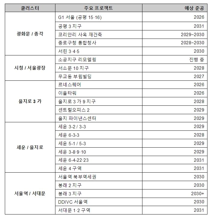 향후 CBD 신규 오피스 공급은 서울광장, 광화문·종각, 을지로3가, 세운지구, 서울역 등 주요 재개발 클러스터(redevelopment cluster)를 중심으로 단계적으로 유입될 것으로 예상된다. 또한 SK그룹 계열사의 통합 이전 움직임 역시 도심 오피스 시장에 영향을 미칠 가능성이 있다.